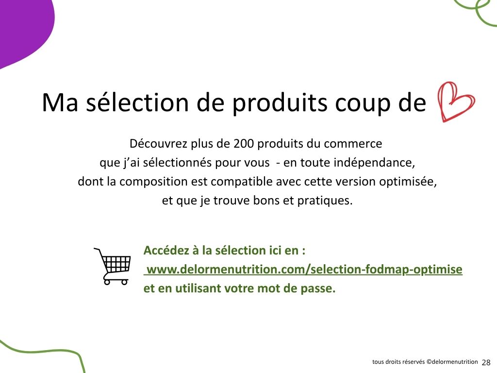 🛒 Et l’accès exclusif à ma sélection – en toute indépendance – de plus de 200 produits du commerce compatibles avec la version FODMAP optimisée (plats, desserts, biscuits, boissons….).